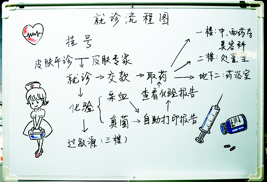 面对日门诊量大的实际情况,如何提高门诊导医服务质量和效率亟待解决。皮肤科门诊立足岗位实际,积极拓宽思路,推出导医手绘提示板,利用白板定期推出手绘就医提示画,内容涉及流程提示、常见皮肤病常识提示等,希望能用这样生动简洁的形式,帮助患者及时了解门诊就医流程,熟悉基础皮肤病的护理和预防。